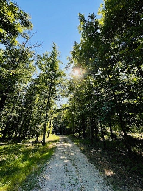 Early evening cocktails while sitting at the edge of the woods. While sometimes it is a glass of tea or a bottle of water, it is also often a glass of scotch or Prosecco. The beverage pales to the view. I absolutely love my side yard, and I have since construction. I designed the cottage a little cockeyed on the land because I selfishly wanted the two places that I anticipated wanting to look at the most on the two sides, with the side patio/kitchen window and the other the screened porch. The side patio and yard give you the perfect view of the woods. It is gorgeous.